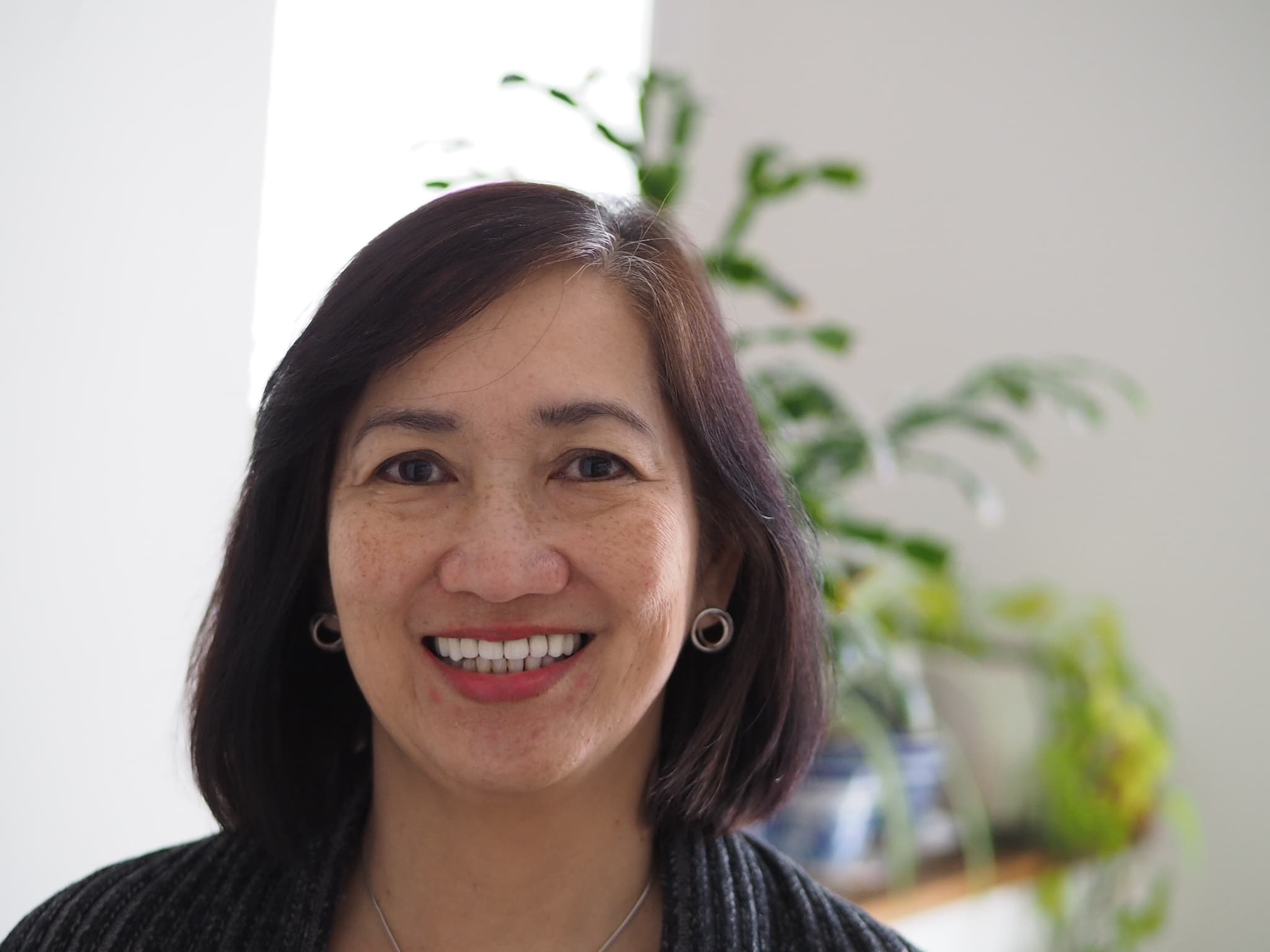 Evangeline, a smiling woman with shoulder length brown hair, looking at the camera in front of a green plant in a sunny room.